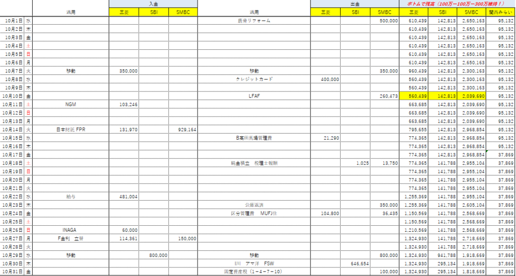 資金が最も少なくなる、毎月10日前後を黄色でハイライトしてある。